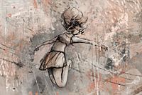 Een semi abstract kunstwerk van een vrouw die springt. Deze dame springt in de lucht. De achtergrond is ingekleurd met oranje, roestbruin en warme grijs tinten. Een werk met veel oog voor detail. De vrouw draagt een rok en een topje.
