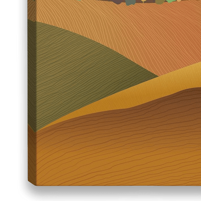 Abstract landschap met velden, een rij bomen en heuvels in de licht gouden herfstzon. De kleuren zijn typische herfstkleuren met de focus op warme oranje- en bruin-tinten.