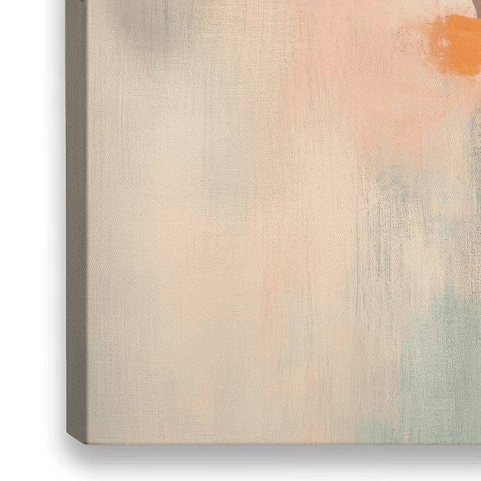 Dit werk heeft een serene, bijna mystieke uitstraling met zachte roze, oranje en grijstinten die in een vloeiende, minimalistische vorm overlopen. Het lijkt alsof een figuur of vorm zich half verschuilt achter een sluier van mist, terwijl het donkere gebied eromheen een gevoel van diepte en mysterie creëert. De vage overgangen tussen de…