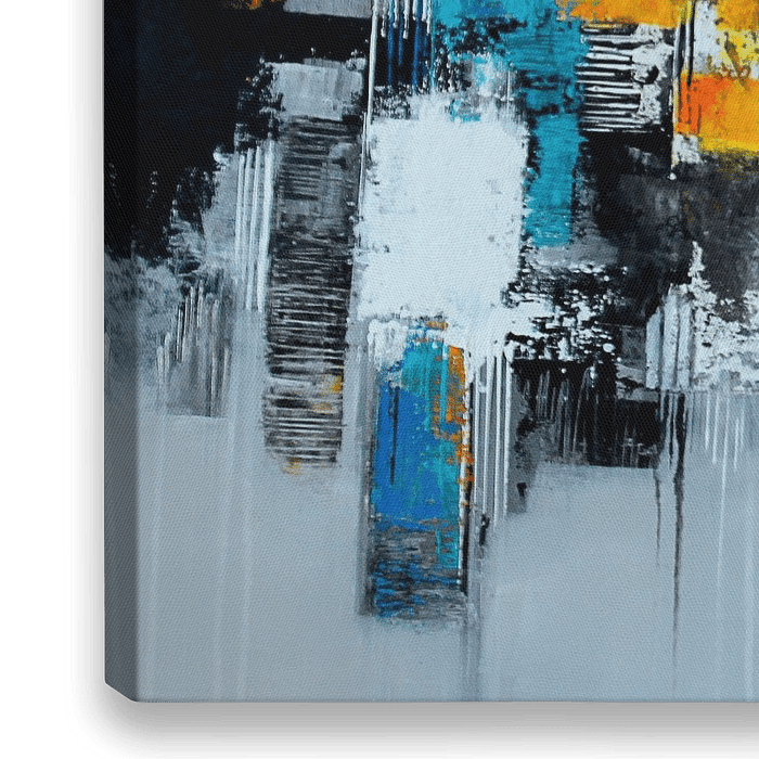 abstract schilderij in acryl, spateltechniek, modern en decoratief, eigentijds schilderij, expressief schilderij, zwart, wit, turkoois, oranje-geel, decoratieve muurschildering voor de moderne woonruimte, kantoor, praktijk
