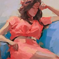 Abstract portret "Lady in red". Abstract portret van een vrouw in een zacht rode jurk, zittend op een blauwe bank.