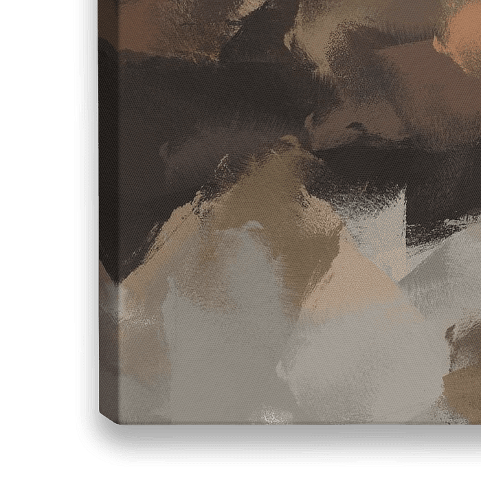 Abstract schilderij, geïnspireerd op een berglandschap met een blauwe lucht erboven. Aardetinten en blauw.