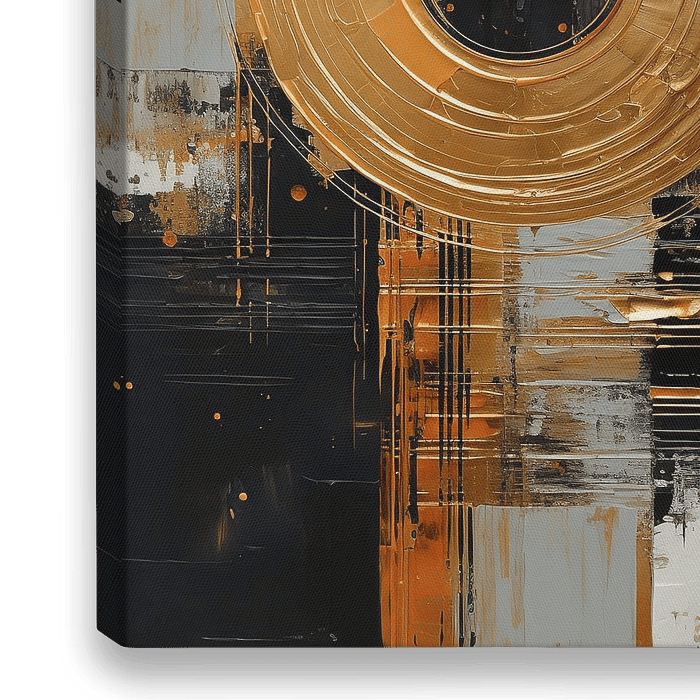 Dit abstracte schilderij verkent de kracht van contrast en minimalisme. Dominerende zwarten en gouden tinten creëren een intrigerend spel van licht en schaduw. Het schilderij straalt een mysterieuze, tijdloze energie uit, waarbij de kleuren samensmelten tot een harmonieuze en toch enigmatische compositie.