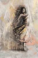 Een semi abstract kunstwerk in grijs zwart en wit. Deze vrouw draagt een jurk en heeft lange haren die dansen in de wind.