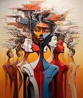 Dit abstracte schilderij toont een Afrikaanse vrouw met een intrigerend, bijna technologisch uiterlijk. De kunstenaar gebruikt geometrische vormen en futuristische lijnen om haar figuur weer te geven, waardoor ze bijna als een holografische verschijning lijkt. De kleuren zijn levendig en contrasterend, wat het schilderij een opvallend…