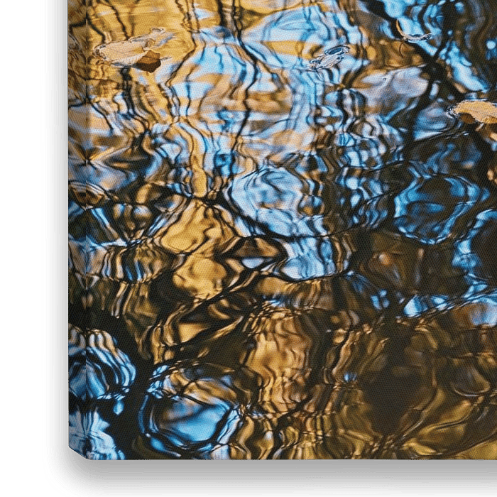 Geloof het of niet, maar dit is het water van de vijver in het Julianapark in Utrecht. Als je op detail gaat kijken, zie je ook bladeren drijven van de omringende bomen. Die zie je ook met hun herfstkleuren rood en geel weerspiegeld. Dit vind ik mooi voor aan de muur.