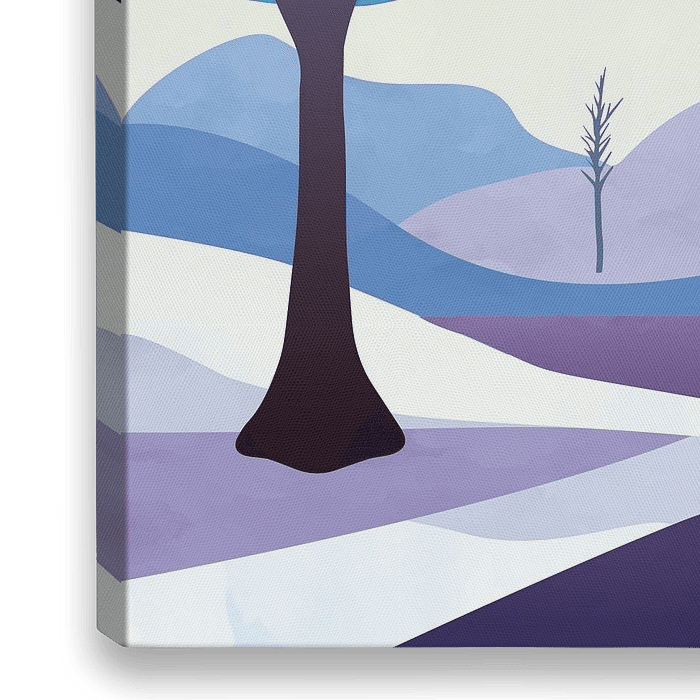 Abstract landschap met bomen aan de oever van een rivier met meer bomen, heuvels en bergen in de verte. Het kleurenpalet omvat naast wit gedempte tinten blauw en paars, die de scène een vredige en bijna dromerige sfeer geven.