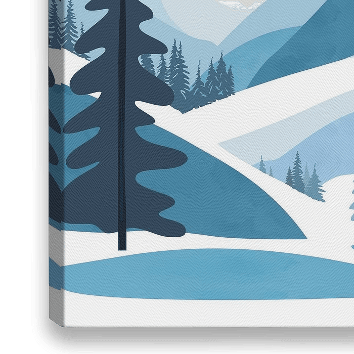 Abstract landschap met bomen, heuvels en bergen in de sneeuw. Het kleurenpalet omvat naast wit en grijs vooral gedempte tinten blauw, die de winter scène een vredige sfeer geven.