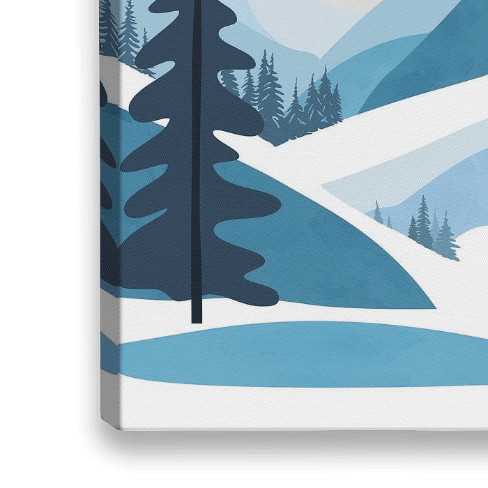 Abstract landschap met bomen, heuvels en bergen in de sneeuw. Het kleurenpalet omvat naast wit en grijs vooral gedempte tinten blauw, die de winter scène een vredige sfeer geven.