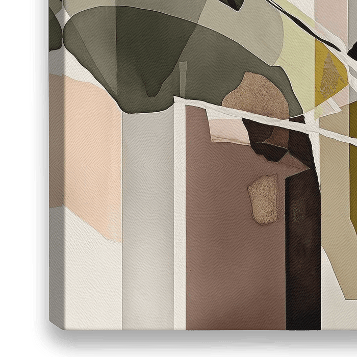 Een abstract kunstwerk met stijlvolle kleuren. De kleuren die gebruikt zijn in het werk zijn okergeel, olijfgroen en zwart. Het geheel is opgebouwd uit verschillende abstracte vormen die met elkaar zijn verbonden. Door het gebruik van deze abstracte vormen ontstaat er een dynamisch en organisch geheel.