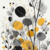 Sierlijke lijnen, botanische vormen en abstracte elementen, De oker gele en antraciet kleuren vormen een harmonieus contrast dat de elegantie van het kunstwerk versterkt. Een bijzondere toevoeging aan elke kunstcollectie. Een perfecte aanvulling voor liefhebbers van botanische en abstracte kunst.