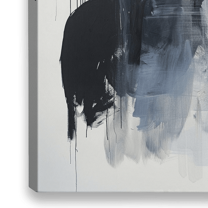 Abstracte Diepte - Dit abstracte schilderij toont een expressieve samenstelling van grootse penseelstreken in voornamelijk zwart en blauw, uitgevoerd met een dynamische, bijna agressieve techniek die diepte en emotie uitdrukt.