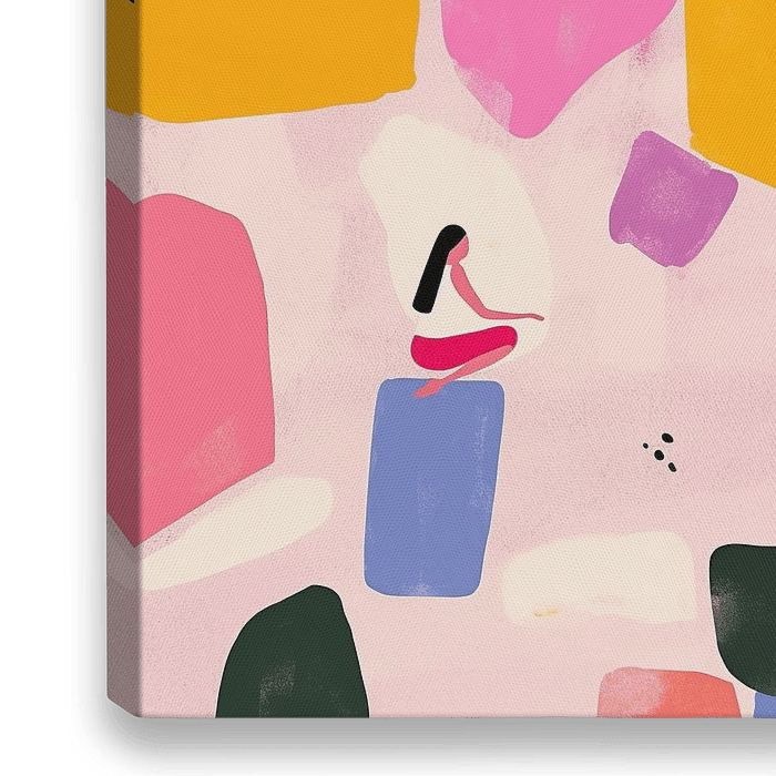 Abstracte Figuren - In dit abstract schilderij zie je twee figuren, een vrouw in een groene outfit en een andere figuur, die omringd zijn door vrolijke, kleurrijke vormen in onder andere roze, geel en paars op een zachte achtergrond.