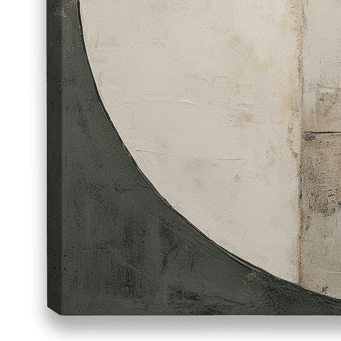 Abstracte Geometrie | Geometrische Rust - Het schilderij toont een abstracte compositie van geometrische vormen in een evenwichtig spel van cirkels en blokken. De kleurstelling is ingetogen met nuances van crème, groen, en terra, verlevendigd door textuur die diepte toevoegt aan de vlakken.