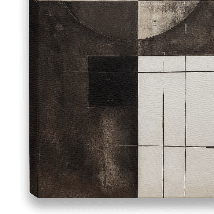 Abstracte Geometrie - Het schilderij toont een abstracte compositie van geometrische en ronde vormen, met een harmonieus kleurenpalet van bruine en crèmetinten. De subtiele textuur geeft diepte aan het vlakke canvas, terwijl strakke lijnen een zekere structurele orde suggereren.