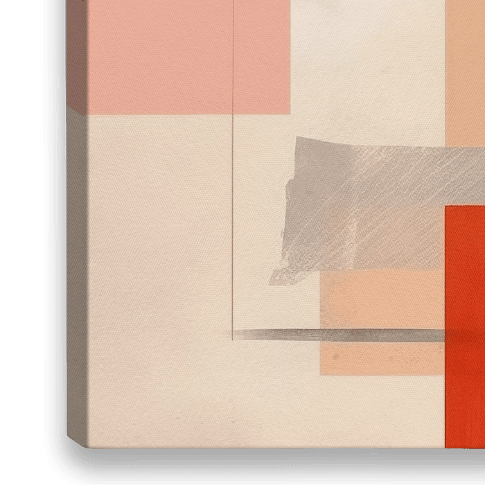 Abstracte Harmonie | Modern Abstract - Dit schilderij presenteert een harmonieuze compositie van geometrische vormen, waar de subtiele gradient van 'Peach Fuzz' mooi overloopt in krachtiger oranjerode tinten, verrijkt door minimalistische grijze en beige onderbrekingen. De stijl neigt naar modern abstract, met een zachte uitstraling die…