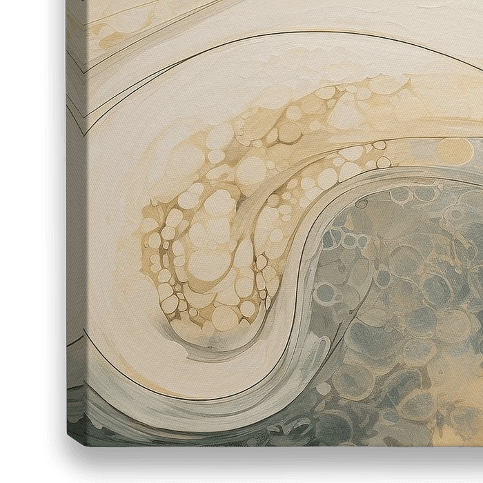 Abstracte Natuur - Dit schilderij, badend in een pallet van warme gouden tonen en herfstachtige beige, brengt ons organische vormen die doen denken aan natuurlijke elementen zoals mineralen of het innerlijke van een schelp. De kunstzinnige vermenging van vloeibare textuur met de helderheid van de kleuren schept een harmonisch spektakel…