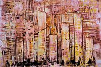Dit kunstwerk vangt de energie van een bruisende stad in een geheel eigen abstracte beeldtaal. Verticale vormen en ritmische patronen doen denken aan hoge gebouwen die baden in een warme gloed van roze, koper en goud. Alsof de skyline van een metropool oplicht bij zonsondergang.