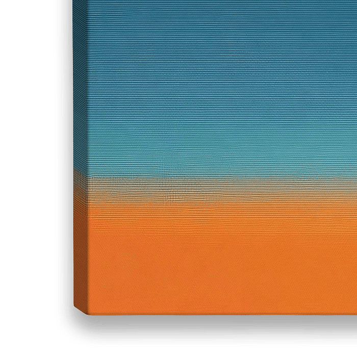 Abstracte Zonsondergang over Horizon - Dit abstract schilderij bestaat uit een rustgevende blauwe achtergrond met een dominante oranje-roze zon cirkel die overgaat in een horizontaal kleurverloop van diepblauw naar gloeiend oranje.