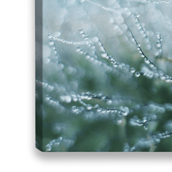 Prachtige abstracte dauwdruppels in close-up vastgelegd op een bloemhoofdje van siergras op een magische herfstochtend. In zachte tinten blauw en groen. Planten en natuur macrofotografie.