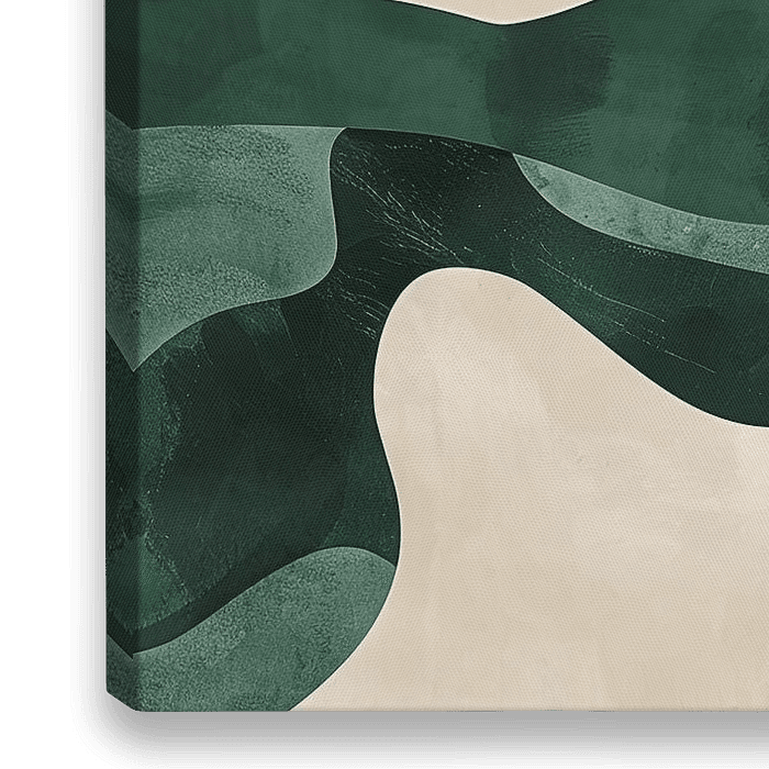 Dit abstracte kunstwerk maakt gebruik van gebogen lijnen en vloeiende vormen in verschillende tinten groen. De golvende patronen creëren een dynamische beweging en geven de afbeelding een levendige energie.