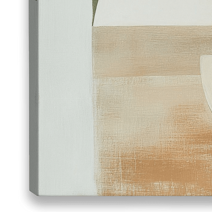 Zachte aardetinten harmoniëren met heldere, geometrische vormen, terwijl de grote, gebogen boog en het ronde oppervlak een gevoel van evenwicht en rust oproepen. De harmonieuze compositie nodigt uit om te blijven hangen en laat ruimte voor interpretatie, terwijl het heldere wit doet denken aan helderheid en openheid. Een sfeervol…