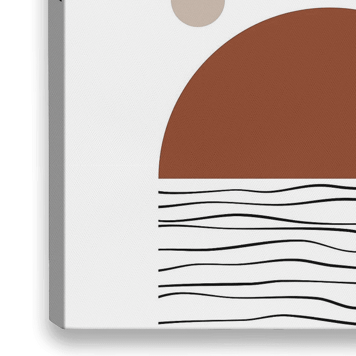 Abstracte minimalistische illustratie van donkerrode halve cirkels met zwarte lijnen erboven en twee beige cirkels. De vormen hebben een rustige look en past goed in een modern/boho interieur.