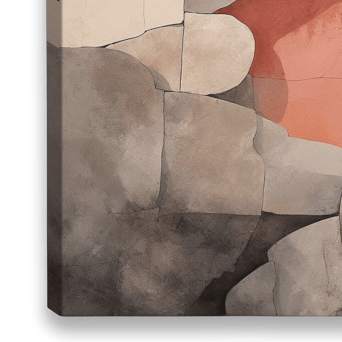 Abstractie | Peach Fuzz Abstract - Het abstracte schilderij toont een composiet van geometrische vormen met een subtiele textuur die diepte suggereert. De kleuren variëren van warme Peach Fuzz, terracotta en beige tot de contrasterende grijstinten, die samen een zacht maar krachtig palet vormen, perfect voor een rustig maar interessant…