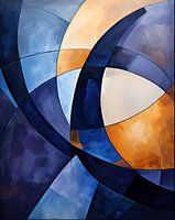Abstract schilderij met bogen en vlakken in blauwe, paarse en beige tinten. Met een oranje - aards - accent. Dit werk is 1 van 3. Het kan heel mooi als zelfstandig werk, met 2 werken naast elkaar, maar is ook prachtig als 3-luik.