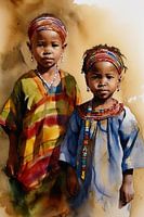 Dit aquarel toont een tweetal Afrikaanse kinderen gekleed in levendige traditionele kleding. De levendige kleuren en details brengen de rijke cultuur van Afrika tot leven. Het is een prachtige en inspirerende toevoeging aan elke ruimte.