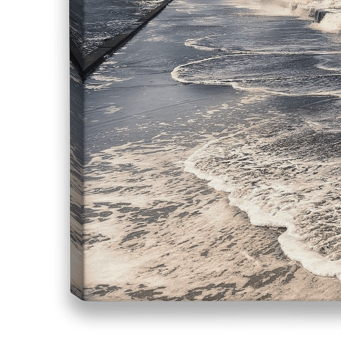 De foto neemt je mee naar een moment van intense beweging en energie, waarbij de golven als dansende waterpartijen de pier omringen. Het vastleggen van dit vluchtige moment in de tijd creëert een blijvend kunstwerk dat de kracht en pracht van de natuur tot leven brengt.
