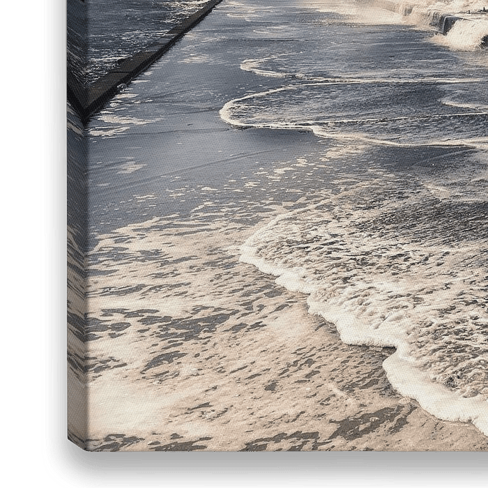 "Against the tide" is een indrukwekkende foto die je meeneemt naar de dynamische kust van Hoek van Holland. Het beeld toont een bijzonder fenomeen dat tijdens een wandeling over de pier werd waargenomen: de krachtige wind en het opkomende tij zorgden ervoor dat de golven met kracht over de pier sloegen.