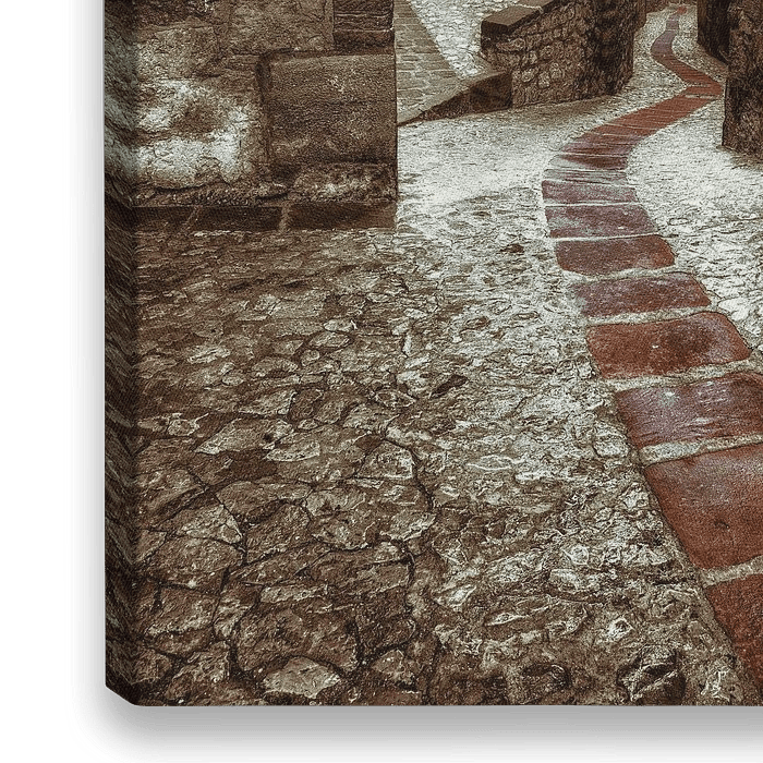doorkijkje in prachtig oud middeleeuws straatje in Albarracín, Spanje met keien en een tegelpaadje.
