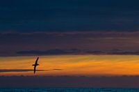 Albatros boven oceaan in de ochtend met eerste licht van de opkomende zon in de ochtend. Silhouet van de albatros tegen de bewolkte gekleurde lucht.