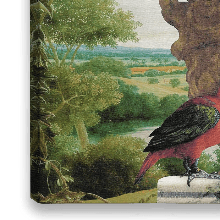 Collage met papegaaien. Het is een door mij gemaakte samenstelling van een schilderij van Melchior d'Hondecoeter (Utrecht, 1636 – Amsterdam, 3 april 1695) en het schilderij "Landschap in Brazilië", in 1652 geschilderd door de Nederlandse kunstschilder Frans Jansz. Post.