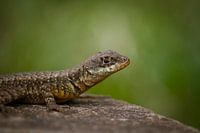 Prachtige hagedis die in Brazilië poseert op een rots tegen een mooie groene achtergrond.