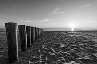 Foto in zwart wit van de zonsondergang op het strand aan de westkant van Ameland