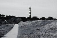 In een zwart-witfoto, vastgelegd met een Leica-camera, torent de vuurtoren van Ameland statig uit boven de horizon. Zijn slanke vorm contrasteert met de dreigende lucht, terwijl zijn kenmerkende strepen dramatisch afsteken tegen de donkere omgeving. Het beeld ademt een sfeer van tijdloze elegantie en kracht, waarbij de vuurtoren trots…
