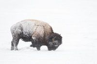 Amerikaanse bizon (Bison bison), over en weer ingelegd door sneeuw en ijs tijdens het foerageren, Yellowstone NP, Wyoming, USA.