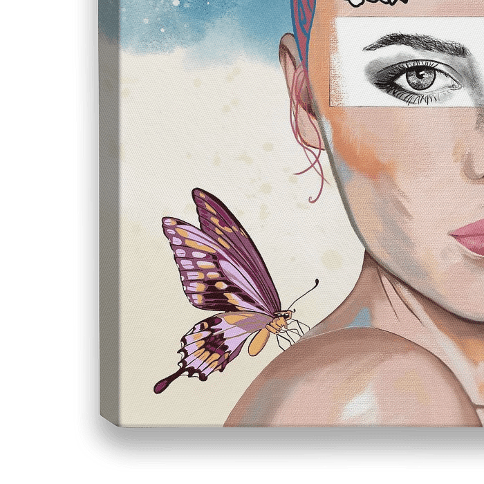 Portret van een vrouw, vlinder en bloemen met een mixed media achtergrond.