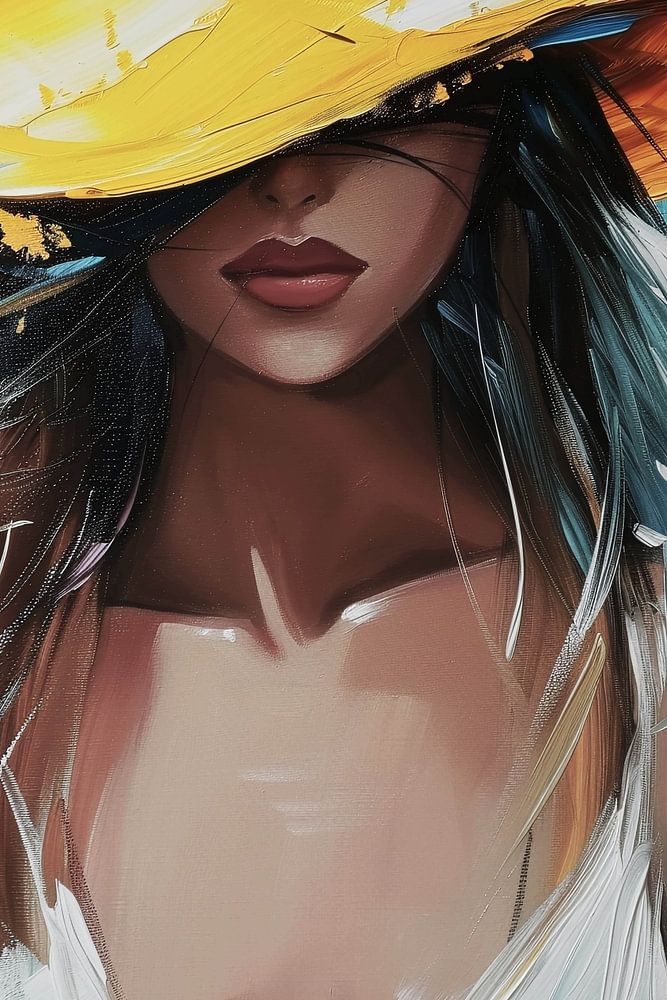 Zomerse frisheid uit, met een vrouwelijke figuur die een oogverblindende, zonnegele hoed draagt. De hoed vormt een stralend middelpunt tegen de koele, blauw-witte achtergrond, die herinneringen oproept aan een heldere hemel vermengd met de zachte beweging van de zee. De vrouw is weergegeven met een gevoel van mysterie; haar ogen zijn verborgen, wat het geheel een intrigerende anonimiteit verleent.