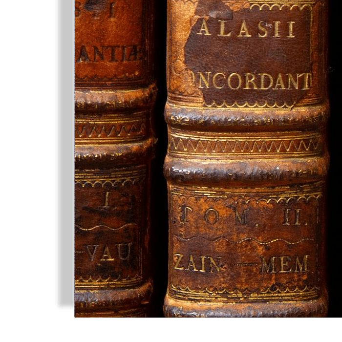 Prachtig detal van een rij oude boeken met bruin lederen kaft. Met de Biblia Hebraica en CalasII Concordant. Mooi decoratief of van waardevolle theologische betekenis.