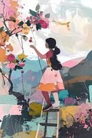 Een meisje plukt een appel, ze staat op een trap om bij de takken van de boom te komen. Kleurig bijna figuratief kunstwerk.