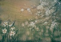 Aquarel of waterverf schilderij van een bloementafereel. Je ziet de takken van een witte magnoliaboom met nog wat bloesem aan, en onderin zie je enkele kamillebloemen. De achtergrond is grijs bruin.