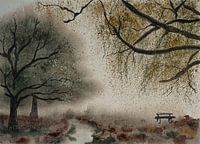 Aquarel of waterverf schilderij van een mistig heidelandschap. Het is herfst en de bomen vertonen prachtige herfstkleuren. Je ziet een wandelpad en een zitbankje.