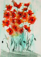 Aquarel of waterverf schilderij van een bosje klaprozen, met een turkoois achtergrond. Het schilderij is op een losse manier gemaakt, waardoor de kleuren in mekaar overvloeien.