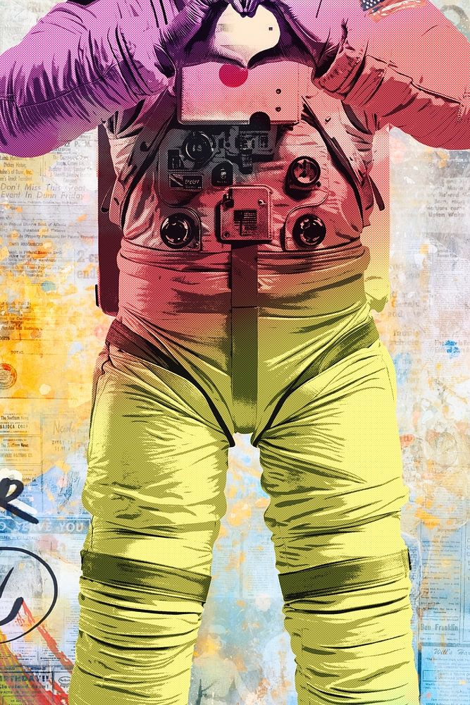 Voor dit werk heb ik bewust gebruikgemaakt van digitale halftone zeefdruk-technieken, een knipoog naar zowel klassieke pop-art als moderne printmaking. De fijne rasterpatronen over de astronaut zorgen voor een analoge, bijna tastbare kwaliteit, terwijl de kleuren en neonachtige accenten verwijzen naar mijn eigen Neon-collectie. Hierdoor ontstaat een mix van street art, digitale kunst en handmatig gemonteerde lagen — een stijl die rauw én verfijnd tegelijk voelt.
