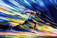 Deze abstracte afbeelding toont een sprintende mannelijke atleet met levendige bewegingsonscherpte-effecten om snelheid, energie en futuristische sportactie te benadrukken. De dynamische lijnen en felle kleuren rond de atleet creëren een gevoel van uitzinnige beweging en intense kracht. De atleet, omringd door fel blauw en rood, lijkt…