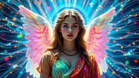 De prachtige engel zweeft zachtjes in een hemel van pastelkleuren die een gevoel van vrede en harmonie verspreiden. Zijn grote, vederlichte vleugels zijn een fascinerend kleurenspel van iriserend blauw, zacht roze en stralend goud. Elke vleugelslag is een symfonie van licht die de omgeving in een warme, gouden gloed hult.