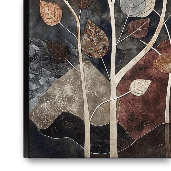 Een collage van bomen en herfstblaadjes in aardetinten met grijsblauw en taupe tinten.